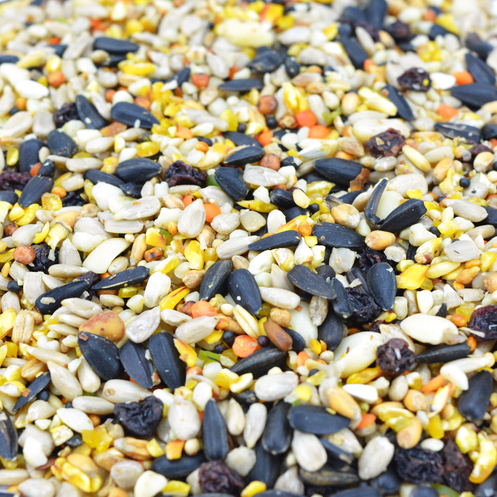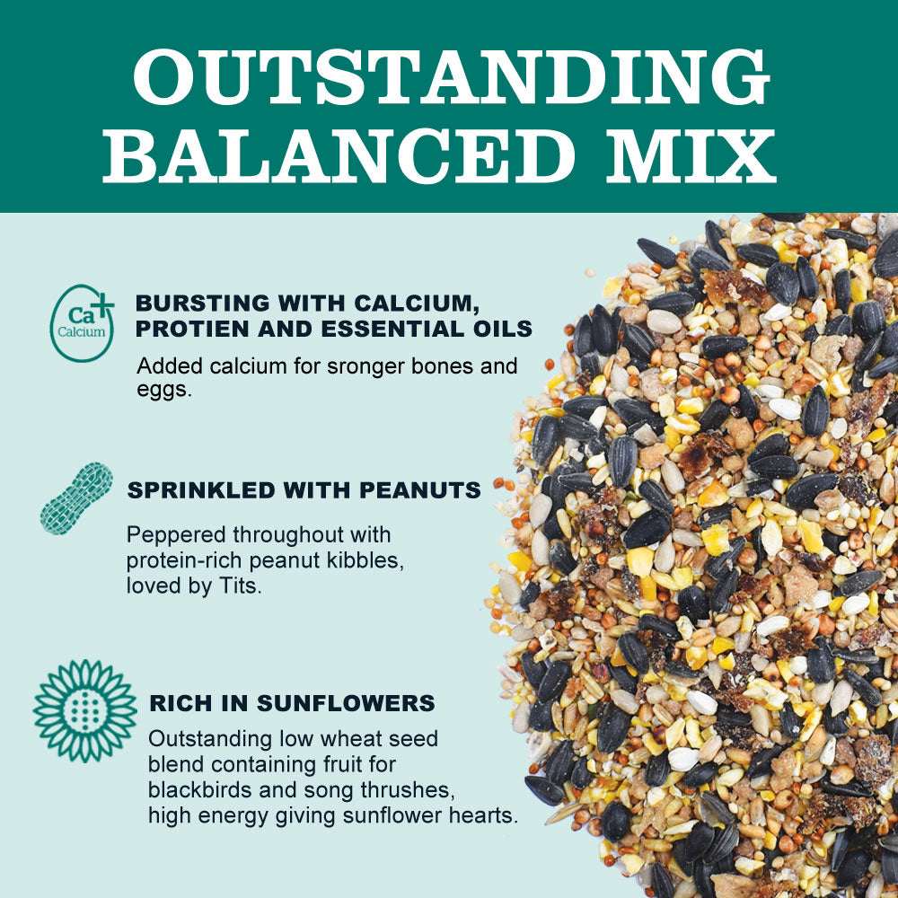 Outstanding low wheat seed blend containing fruit for blackbirds and song thrushes, high energy giving sunflower hearts and peppered throughout with protein-rich peanut kibbles, loved by Tits. A well balanced blend designed to attract the widest variety of wild birds to your garden.