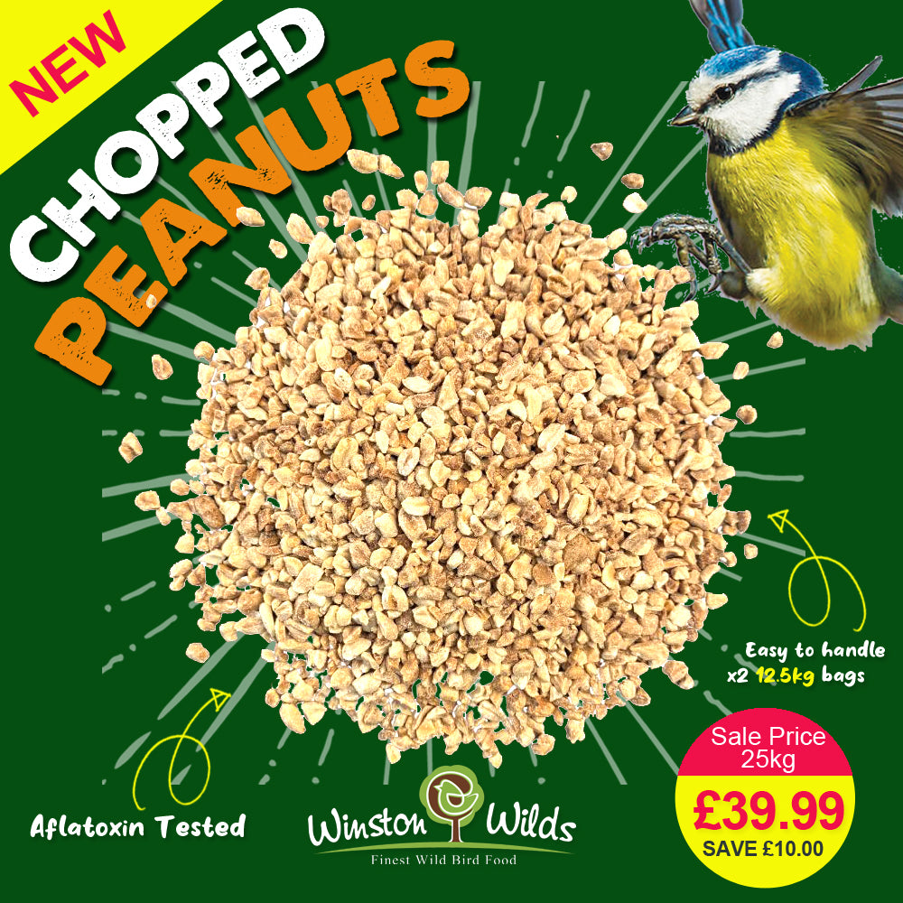 Our Chopped peanuts which are perfect for smaller birds and fledglings as their small bite-size helps prevent the choking hazard that is present when feeding whole peanuts that are not fed from mesh feeders. Winston Wilds chopped peanuts originate from only the finest blanched nut, those that are bursting with oils, plump, and aflatoxin tested. We love chopped peanuts nibs due to their versatility, you can feed from a seed feeder, bird table, ground feeder, peanut feeder or enhance your seed by mixing our peanut nibs within. A firm favourite feed during the breeding and fledgling season. Birds love and seem to favour to take a chunk of our peanut nibs and perch upon a close branch where they feel safe from predators.